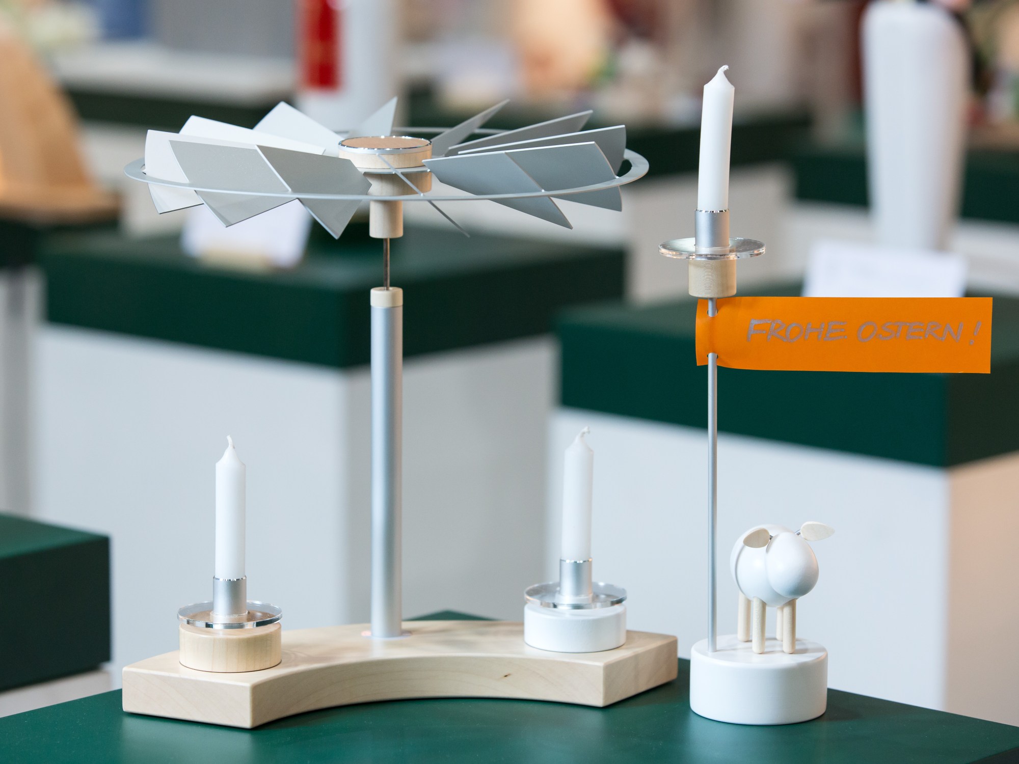 Osterlamm mal anders – Wie kommt bei Ihnen das Osterlamm auf den Tisch? Michael Näumann aus Seiffen schlägt vor: „Ganz in Weiß, mit schönem Kerzenschein“. Zusammen mit dem modernen Flügelrad aus Holz und Metall lässt sich daraus sogar eine stilvolle Osterpyramide kreieren. Und wenn’s dem Schäfchen zu lammweilig wird, gesellt sich gern der neue Esel aus dem Hause Näumanns dazu