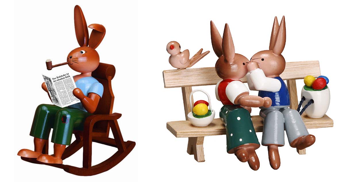 Neben den Neuheiten stehen zu Ostern auch die Klassiker aus dem Erzgebirge hoch im Kurs. Bei den Osterhasen erfreuen sich seit vielen Jahrzehnten die Knickohrhasen aus Gahlenz großer Beliebtheit. Ihr Markenzeichen: das fesch geknickte Löffelohr. Ein echter Dauerbrenner sind auch die Spitzohrhasen der Marke ESCO aus dem Hause Zeidler Holzkunst. Die Hasenschule und die Hasenbank sind aus kaum einer Osterdekoration wegzudenken.